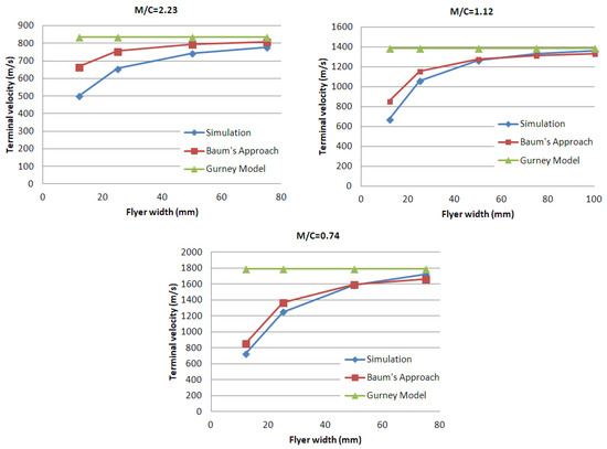 This creates a large discrepancy in flyers with smaller widths. In other words, when the charge width becomes large, the Baum’s approach may lose its effectiveness because the removed charge weight is always constant, and becomes relatively smaller. (4) As the width of the flyer gets larger, the simulation approach, Baum’s approach, and the Gurney model show a good agreement regarding the flyer velocity (Figure 8). This is an important observation because it may deliver a range where all three approaches are under a reasonable agreement, and an analytical solution may exist. In addition, it was observed that when the value decreases, the discrepancy between Baum’s, and the Gurney Model, reduces, which represents a general solution tendency for different approaches (Figure 8).