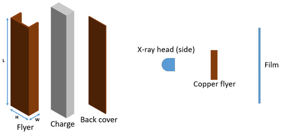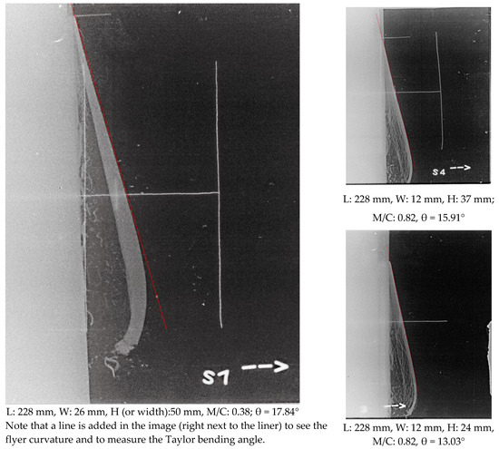 If the flyer turning angle during the flyer projection, and the detonation velocity of the charge behind the flyer are known, then one can obtain the velocity of the flyer. If the velocity of the flyer gets affected by the width of the flyer, then the Taylor turning angle should be affected by this as well. In order to see the flyer velocity variation depending on the flyer width change, the following tests with 9 in. (228 mm) long copper flyers (density 8.9 ), with three different flyer widths (24, 37 and 50 mm.), were accomplished (Figure 12). All of the X-ray shot images were taken 35 μs after the initiation in order to see the entire projection of the flyers. The charge behind the flyer is multi-layers of RDX based sheet-explosives with a measured detonation velocity of approximately 7.12 km/s, and a density of 1.44 . Note that the type of charges used in the simulation and the field-test do not match due to the technical limitations in achieving a uniform/precise charge density in the field-test configuration and within the given budget range.