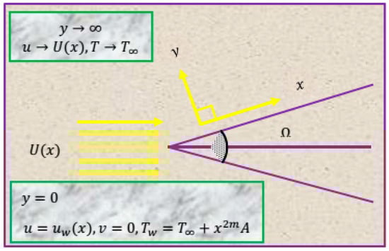 The radiative and dissipative colloidal suspension of water and ethylene glycol suspended by cobalt ferrite and Mn-Zn ferrite is under consideration over a non-static wedge. The flow obeys the characteristics of incompressible flow. The flow configuration is taken in the Cartesian coordinate system. and denote the main stream and wedge velocities, respectively. Furthermore, represents the Hartree pressure corresponding to . Moreover, the temperature of the wedge wall is a function of x and is , where shows the free stream temperature. Figure 1 depicts the flow configuration with coordinate axes: