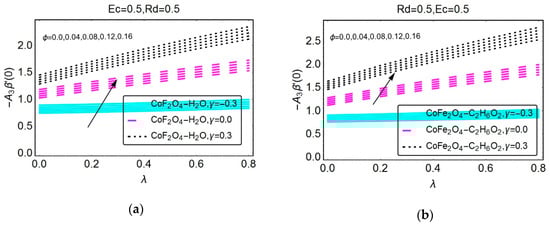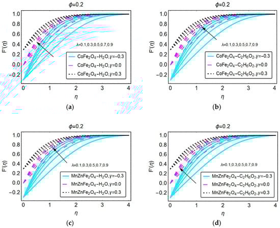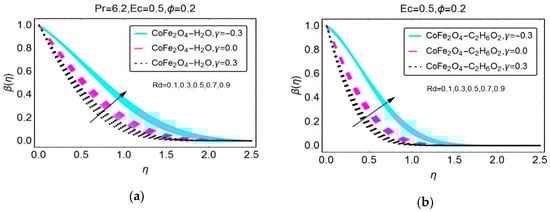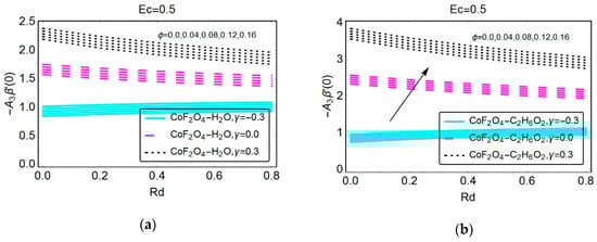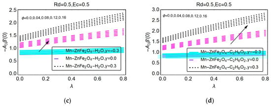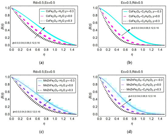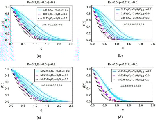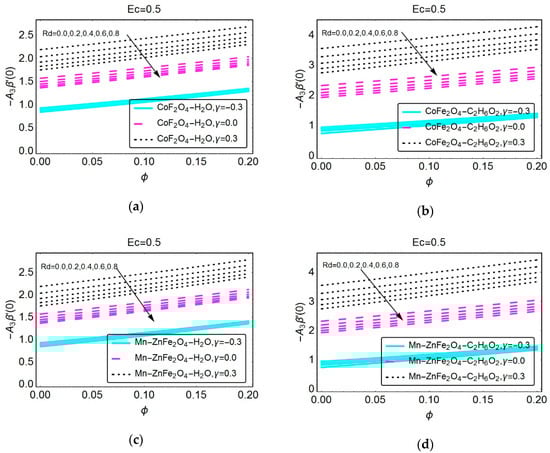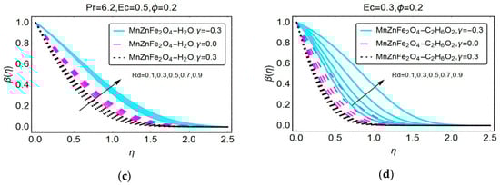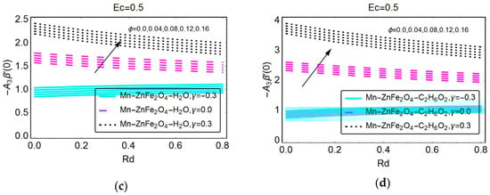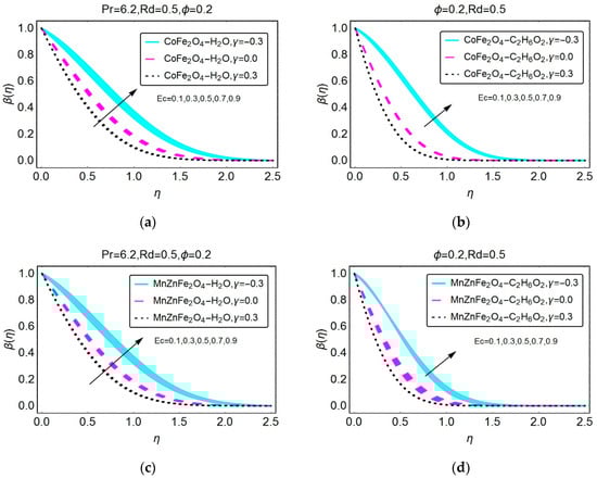 Varying the flow parameters significantly alters the temperature distribution. These parameters are the radiation parameter, Eckert number faction factor of the nanoparticles, and . These effects that are portrayed in Figure 3, Figure 4, Figure 5 and Figure 6 for the nanofluids under consideration. It is examined that the temperature enhances for the flow of water composed by the cobalt and Mn-Zn and drops for ethylene glycol based hosting fluid. These temperature effects are due to varying Hartree pressure and are displayed in Figure 3. For the opposing wedge condition, the nanofluids velocity drops, which is due to the particles slowly becoming colloid and alternately the temperature drops. On the other hand, for the assisting case, the collision between the particles increases due to the alike motion of the nanofluids and the wedge, which promptly enhances the temperature. These effects of the temperature , as highlighted in Figure 3 for feasible Hartree pressure gradient parameter .