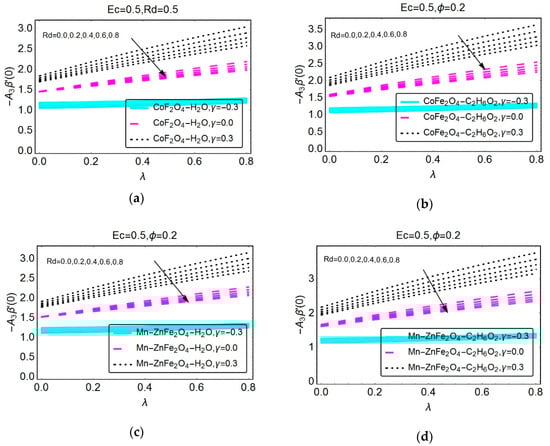 The variations in the local heat transfer rate by altering the radiation and volume fraction parameter described in Figure 7. The transfer rate is rapid for strong thermal radiation parameter Rd. For Ethylene glycol based nanofluids, drops in the local heat transfer rate are noted. For opposing flow, less amount of heat transfers at the wedge surface in comparison with the static and moving wedge, respectively. For smaller , the heat transfer rate is quite slow. Figure 8 highlights the impacts of fraction factor on the heat transfer at the wedge. The higher values of lead to increasing the behavior of the heat transfer. The up turns in the nusselt number are inspected for alike nanofluids flow. For the static wedge condition, the heat transfer slowly varies in comparison with opposing and assisting flow situations. The heat transfer quite rapidly arises for EG based nanofluid and effects of Rd and Hartree pressure elaborated in Figure 9.