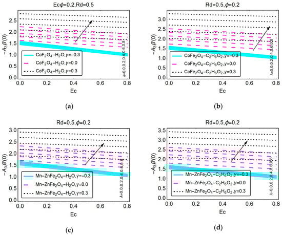 Alterations in the local nusselt number for (a) ; (b) ; (c) ; (d) nanofluids by varying and Ec.
