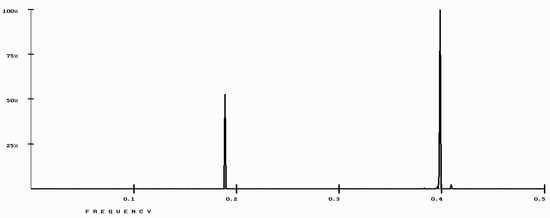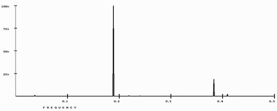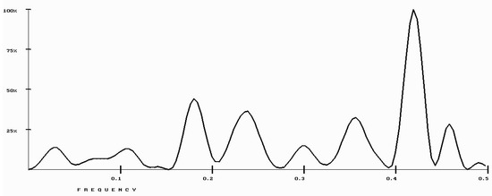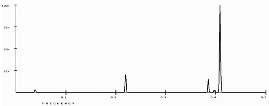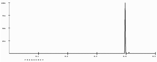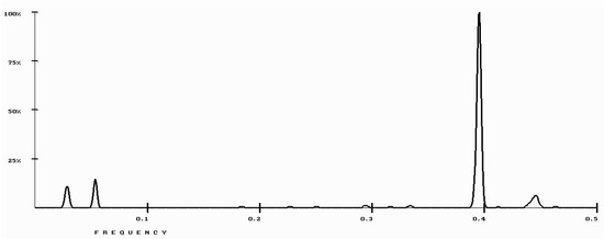 To find out if frequency f3 is indeed common for parathyroid hormone proteins and SDF-1α proteins, these proteins have been analysed using the RRM. The prominent common frequency was found to also be at f3 = 0.3975 ± 0.0108, as shown in Figure 7. According to RRM model this frequency represents an electromagnetic radiation wavelength of about 502 nm.