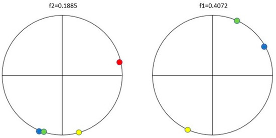 It is important to note that both fragments have peak frequencies at both parathyroid hormone functional frequency f1, as well as receptor recognition frequency f2. However, when phases at these two frequencies have been calculated for peptide fragments, it was found that phases at frequency f2 for receptor recognition were similar and opposite to phase for receptor at frequency f1, confirming that both fragments are binding to the receptor. In addition, phases at frequency f1, characterising parathyroid hormone function for fragment PTH 1-34, is close to phases for PTH, while phases for fragment PTH 7-34 was opposite to phases for PTH. This means that both fragments have the ability to interact with receptors at frequency f2, while fragment PTH 1-34 has the same function as PTH due to similar phases at frequency f1, and fragment PTH 7-34 does not have the same function as PTH due to opposite phases at frequency f1. Phases for the parathyroid hormone protein, fragments and receptor at both frequencies are presented in Table 1, as well as on phase circles shown in Figure 5.