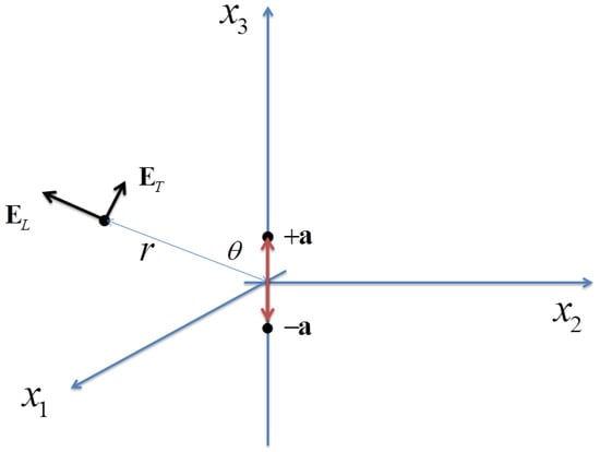 With reference to Figure 1, consider an oscillating dipolar source with two opposite charges at and , of the following form: