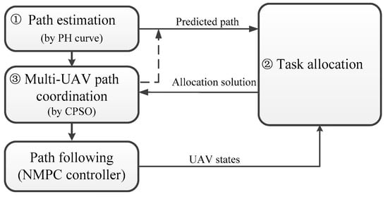 Inspired by the hierarchical control framework [25,26,27] of a multi-UAV system. The mission planning method was divided into three layers in this paper, as shown in Figure 1. The first layer was the path estimation process, a Particle Swarm Optimization-based method (shown in Section 4.2) was employed to generate a PH path for each UAV as an estimated path. The length of the estimated path was seen as the input for the task allocation process, the estimated path was used to decouple the task allocation and path planning problems. In the second layer, the task allocation process assigned targets to UAVs that optimized the system performance. A task allocation algorithm was proposed to assign the targets. In the task allocation process, the resource requirement of targets, resource consumption and task sequence of UAVs were taken into account. In the last layer, according to the task allocation strategy, a path planning method was proposed to generate flyable and safe paths for the UAVs considering the task sequence of each UAV. In this layer, the simultaneous arrival, UAV’s kinematic and collision avoidance constraints were considered (detailed explanation can be found in Section 4.3). Finally, a path following process was used to generate the control signals for the UAV team. As the path following was not the focus of this paper, a path following method based on the nonlinear model predictive control [28] (NMPC) was used to track the generated PH paths.