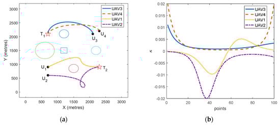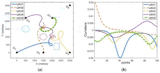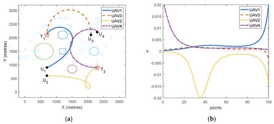 (a) The mission planning results for two targets; (b) curvature of each UAV’s path.