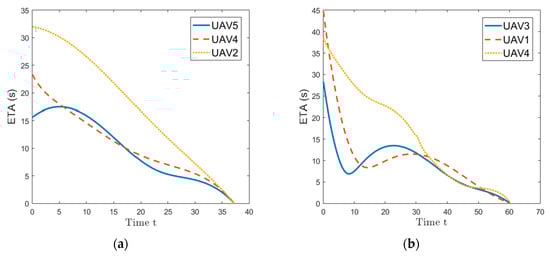 At the initial time, the task allocation algorithm was used to form coalitions for the two targets. In the first allocation round, the UAV was selected as the manager UAV, the target was first to be assigned. The coalition was formed to attack the target simultaneously. As the target was the first assigned target, the CPSO algorithm was used to generate simultaneous arrival paths for these UAVs as shown in Figure 2a. The path lengths of the three UAVs in the coalition from their initial location to the target were , and , respectively. Then, the UAVs in the coalition updated their resources according to Equation (19). The ETAs for the three UAVs are shown in Figure 3a. It can be seen that, the three UAVs could arrive simultaneously to the target .