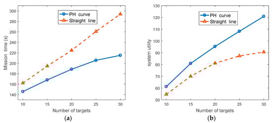 Figure 6b shows the average system utility when using different path estimation methods. While the number of targets increasing, the system utility of the two path estimation methods increased. However, when the straight line was used in the path estimation process, the system utility increased slightly when the number of targets increased. It can be seen in Figure 6, the path estimation process using the PH curve had a much better performance than that using the straight line, especially when the number of targets increased.