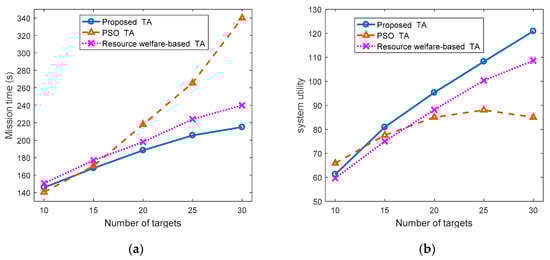 Figure 7a shows the comparison of the average mission completion time of these task allocation (TA) algorithms. Obviously, with the increase in the number of targets, the average mission completion time increased. When the number of targets was 10, the PSO-based task allocation algorithm could obtain the shortest mission completion time. However, the mission completion time using the PSO-based TA algorithm significantly increased with the number of targets. That was because when using the PSO-based TA algorithm, the dimension of particle was too high and increased with the number of targets, it was difficult for the PSO algorithm to obtain the optimal solution in a short time. From Figure 7a, the proposed TA algorithm performed better than the PSO-based and resource welfare-based TA algorithms.