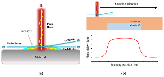 Recently, the photothermal imaging method has been studied as an industrial tomographic tool. It acquires morphological information from the inside of an object by means of the photothermal effect of a temporally modulated heat source [1,2,3,4]. The photothermal effect is a physical phenomenon that occurs when a material absorbs light energy and converts it to thermal energy [5,6]. As shown in Figure 1a, when a material is heated by a temporally modulated pump beam, the temperature of both the air layer on the material surface together and the material itself increases as heat is conducted from the material to the air. In addition, the refractive index of the air layer changes with temperature because of the density change. It is possible to achieve a modulated temperature change through the refraction of the probe beam that passes through the air layer. The physical phenomena that result from the photothermal effect are based on the thermal properties of the target material to be measured. Hence, the phase delay between the period of the refraction of the probe beam and that of the heat source (light energy) must be analyzed in order to acquire information on the thermal properties of the specimen [7,8,9,10,11]. This method can be applied to imaging. As illustrated in Figure 1b, when the surface of a material is scanned by the pump beam and probe beam, the phase delay changes as the thermal properties are changed by the distribution of internal materials.