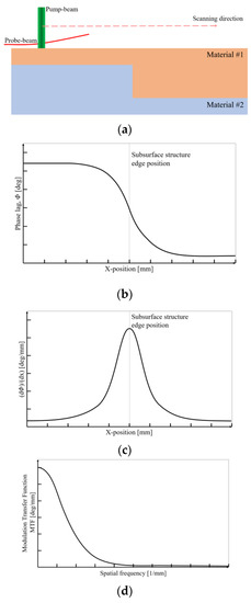 The second method (Method B), which utilizes the LSF, can be implemented in a relatively simple manner [21]. On the assumption that there are infinite specimens with the internal structure shown in Figure 3a in the x- and y-directions, 1-D scanning on the specimen surface using the photothermal imaging method will produce the phase delay change results shown in Figure 3b. The sigmoidal phase difference signal derived near the boundary shown in this figure is called the edge response function (ERF). As the ERF is differentiated, the LSF as in Figure 3c can be obtained.