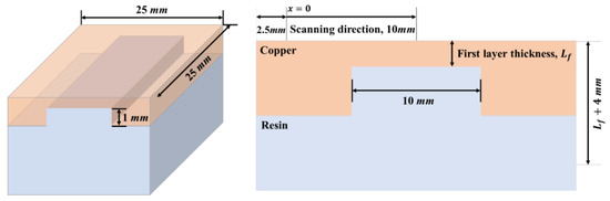 The specimens of the copper-resin double-layered structure that were used in the numerical analysis and experiment are illustrated in Figure 4. The properties of the copper and resin are presented in Table 1. Additionally, Figure 5 presents the optical arrangement of the specimens and laser applied to the numerical analysis and experiment.