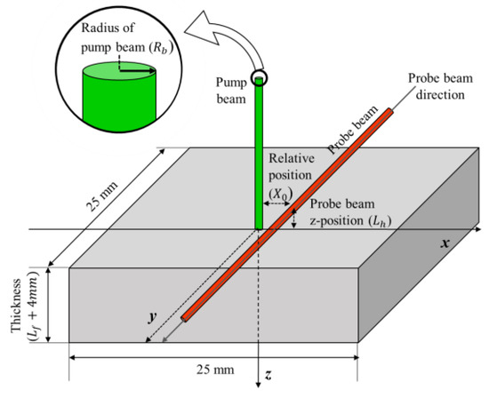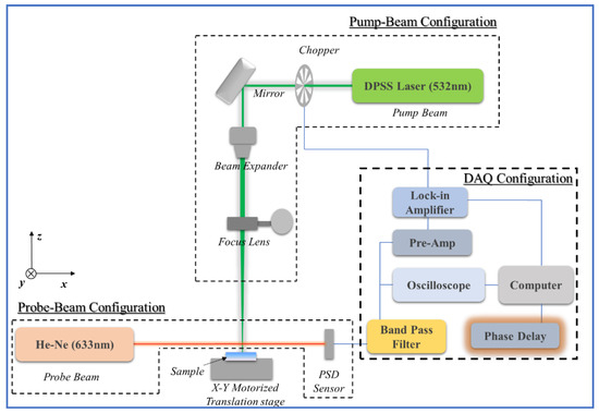 Figure 8 presents the general configuration of the experimental equipment, which consisted mainly of the pump beam, specimen, probe-beam, and data-acquisition configurations. The light source from the pump beam to the probe beam was modulated by a mechanical chopper (SRS 40), passed through a focus lens with a focal length of 1000 mm, and then radiated onto the specimen surface. The intensity of the laser used in this process was 10 W, and a Sprout-G 10-W model with a wavelength of 532 nm, which is a diode-pumped solid-state (DPSS) laser with a Gaussian profile, was used. The radius of the pump beam is determined by the distance from the maximum intensity to in the Gaussian distribution [19], and that radius is adjusted by the focus lens. The specimen to be measured was installed at the specimen section. The specimen was mounted on the Newport optic mount and then fixed on an x–y-axis automatic transport system (x-axis: M-IMS300CCHA; y-axis: M-ILS150PP) consisting of two automatic transport units. The probe beam section was located near the specimen section. The probe beam was an He–Ne laser (Newport 1125 P) with a wavelength of 632.8 nm, an intensity of 5 mW, and a diameter of 500 µm. The modulated refraction of the probe-beam that passed through the air layer on the heated specimen was detected by the position sensitive diodes (PSD) sensor (C10443-01). Thereafter, the reference modulation frequency set by the mechanical chopper and the probe-beam response frequency detected by the PSD sensor were collected by the lock-in amplifier (AMETEK 7270 DSP), and the phase difference between the two signals was calculated. Figure 5 presents the arrangement and relative distance between the probe-beam and pump beam.