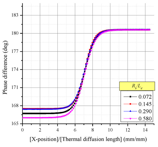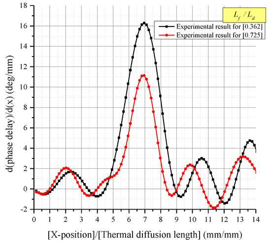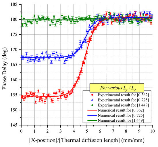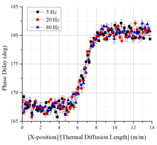 As shown in Figure 5, the length variables of the photothermal imaging method that affect the photothermal effect and phase delay include the pump-beam radius (), the thickness of the first layer (here, the copper layer, ) of the copper-resin double layer, the probe beam’s relative position (), and the z-position of the probe beam (). Theoretically, if the ratio of each factor to the thermal diffusion length is the same, the same phase delay profile should appear when they are nondimensionalized on the basis of the thermal diffusion length () [1,2,24]. As the experimental results in Figure 6 show, the values of , , , and are the same in three conditions of different thermal diffusion lengths depending on the pump-beam frequency, as listed in Table 2. Thus, they formed the same scanning profile.