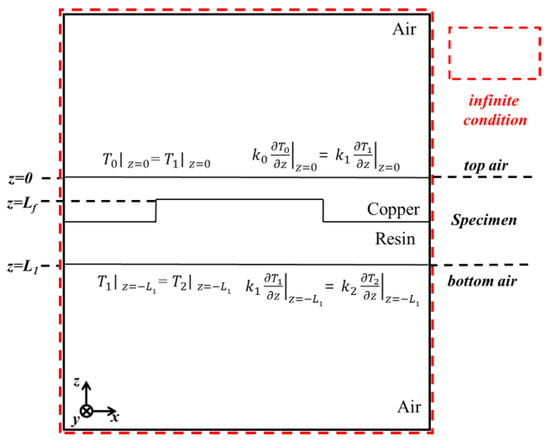 In order to analyze the image quality of the photothermal imaging method, numerical analysis was conducted on specimens with the simple subsurface structure shown in Figure 4. The numerical analysis model had the boundary conditions presented in Figure 7, and it was conducted on the basis of the model established by Kim et al. [3]. Here, the infinite condition means that the physical properties of the adjacent material are infinite [25]. The size and shape of the numerical model specimen are the same as those in Figure 4, and the thickness of the top and bottom air layers is set to 15 mm. Equation (4) is the governing equation for the three areas that consist of three layers: the top air layer, the specimens, and the bottom air layer: