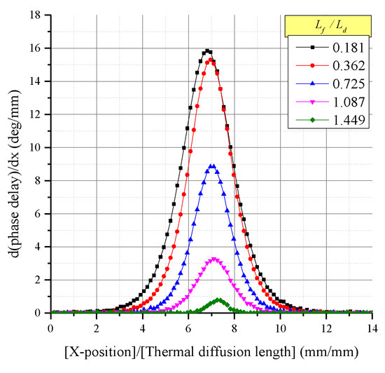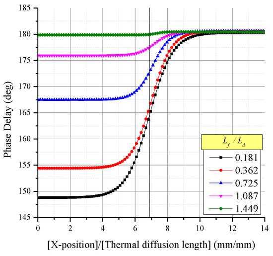 Figure 9 shows the phase delay signals (the ERF on the internal structure) derived by the photothermal imaging method with changed various of . As decreased (closer to the surface), the response to the internal structural change became more intense. As increased (i.e., farther from the surface), the response weakened.