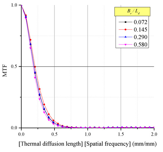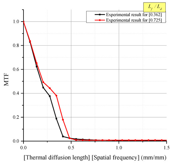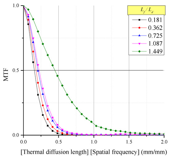The contrast was verified from the MTF derived by applying the FFT to the LSF. Figure 11 shows the contrast according to the change of . As in the case of spatial resolution, the contrast increased together with . In the case of the MTF, it is difficult to compare the general tendency on the basis of a single value. Instead, Table 4 presents the dimensionless spatial frequency (the thermal diffusion length multiplied by the spatial frequency) at which the MTF became 0.5 and the contrast decreased by half.