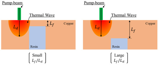 The changes in the spatial resolution and contrast according to revealed that, as increased, the spatial resolution and contrast increased accordingly. A small means that the subsurface structure (resin structure) within the range of the thermal wave has a large influence, and a large means that this influence is small. Figure 12 depicts the physical phenomena depending on . As shown in Figure 12, when a thermal wave of the same size exists in the same position, the subsurface structure can be detected when is small but cannot be detected when is large. For this reason, as increases, the FWHM of the LSF decreases and the resolution increases. However, the photothermal imaging signal should come from the phase delay, which reflects the distribution of the thermal properties within the range of the thermal wave. Therefore, if is large, the influence of the subsurface structure on phase delay becomes small, so the intensity of the ERF decreases.