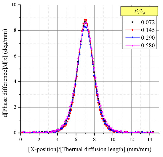 Because the ERF change was insignificant, the LSF also showed no major change. As a result, the spatial resolution change derived from the LSF, as shown in Figure 14, showed a difference of only 10% from the average. The MTF indicating the contrast in Figure 15 also showed the same tendency. In addition, the positions where the contrast decreased by half showed a difference of less than 10% from the average. The reason for this is that the diameter of the thermal wave in the radial direction cannot have influences on the detection of subsurface structure.