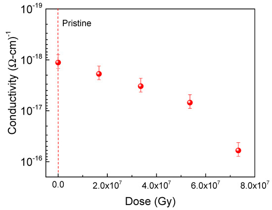 - Yang, G.M.; Sessler, G.M. Radiation-induced conductivity in electron-beam irradiated insulating polymer films. IEEE Trans. Electr. Insul. 1992, 27, 843–848. [Google Scholar] [CrossRef]