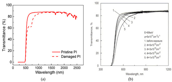 - Shi, J.; Gong, C.; Tian, X.; Yang, S.; Chu, P.K. Optical properties and chemical structures of Kapton-H film after proton irradiation by immersion in a hydrogen plasma. Appl. Surf. Sci. 2012, 258, 3829–3834. [Google Scholar] [CrossRef]