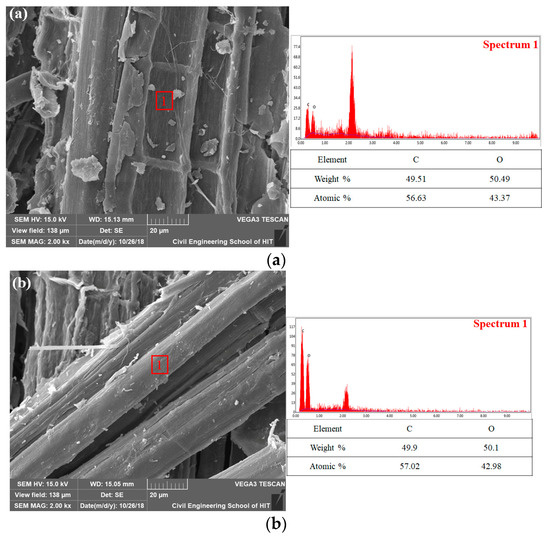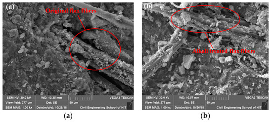 Comparisons of Figure 2a,b illustrate that alkali modified flax fibers adhered better to the matrix as compared to the untreated fibers. Untreated flax fibers showed many impurities on the fiber surface (Figure 1a) while the cellulose of alkali modified flax fibers was directly exposed, improving the anchoring force of the flax fiber in the cement matrix and thus improving the fiber-matrix adhesion. Alkali treatment changed the chemical composition of the fiber by removing amorphous constituents (pectin, hemicelluloses, etc.), thereby increasing fiber crystallinity and roughness [14]. Consequently, alkali treated flax fiber enhances the adhesion and compatibility between the fiber and cement-based matrix. This compatibility, leading to a homogeneous distribution of the reinforcing fibers, is the predominant factor influencing the mechanical properties of the composites [15]. Cement hydration products are more apparent on the alkali modified flax fiber (Figure 3b) as compared to the untreated fiber (Figure 3b). These results indicate that alkali treatment improved the adhesion between the flax fibers and cementitious matrix.