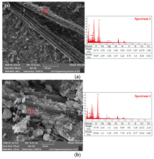 Figure 2a,b show the microstructure of the cementitious composites after 28 days of curing for F0.5 and MF0.5. It is apparent that the flax fiber produces some pores in the matrix, and the incorporation of flax fibers into cement hydrates creates multi-phase boundaries and multiform interfaces.