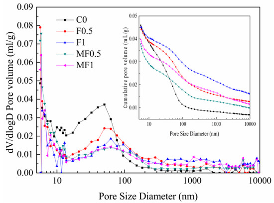 Porosity parameters are important to determine the strength and durability of cement composites. Figure 5 shows the pore size distribution and variation of dV/dlogV with pore diameter of the cement specimens. Table 1 details the classification of the pores and Table 2 shows the proportion by volume of pore structures in the cement specimens. Results suggest that the flax fiber increased macropores (50–10,000 nm) and voids and microcracks (>10,000 nm) in the cement composites. Macropores increased from 27.01% in C0 to 40.64% and 38.81% in F1 and MF1, respectively. The increase is attributed to trapped air in the composite and increased porosity at the interfacial transition zone (ITZ) between the flax fibers and the matrix [16]. This suggests that the porosity increase at the ITZ was mainly due to the porous features of flax fiber, which leads to air import by the addition of fibers into the mixture.