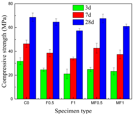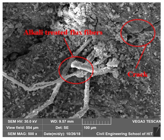 The compressive strengths of the cement specimens are shown in Figure 6. The addition of flax fibers reduced the compressive strength of the cement in all cases. However, the loss of compressive strength reduces as curing age increases; F0.5 compressive strength was reduced by 22.6%, 16.82%, and 5.8% as compared to C0 at curing ages of 3 days, 7 days, and 28 days, respectively. MF0.5 demonstrates that the alkali treatment somewhat offsets the compressive strength reduction caused by flax fiber, with reductions of 21.78%, 7.89%, and 1.46% as compared to C0 at curing ages of 3 days, 7 days, and 28 days, respectively. Notwithstanding, concrete compressive strength decreased with increasing fiber content, even with alkali pretreatment. This was attributed to the presence of the lumen and pore in the wall of the flax fibers, and the fact that flax fibers display obvious hydrophilicity, this essential characteristic induced a stiff fight on the water demand between the flax fibers and cement particles in the mixing step. Hence, the fibers content clearly affect the water availability during cement hydration [17]. Moreover, water was released from the fiber towards the end of cement hydration, producing a water-cement ratio gradient near the fiber (the water-cement ratio near the fiber was higher). The higher water-cement ratio increased the porosity of the composite and thus reduced adhesion between the fiber and matrix. Furthermore, flax fibers have lower rigidity as compared to conventional fibers, reducing dispersion during mixing and promoting the formation of balls [18]. Some carbohydrates in the flax fiber (e.g., pectin) disturb the hydration reaction of the cement and delay the initial setting time of cement composites [7]. Alkali treatment dissolves the pectin and other impurities from the flax fiber, improving the progress of hydration [7]. As shown in Figure 6, increased flax fiber content decreased the compressive strength of cement specimens due to the undispersed fiber producing microfractures within the matrix (Figure 7).