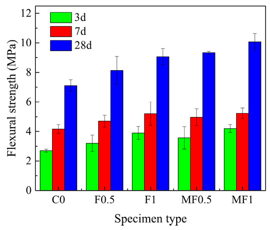 The flexural strengths of the cement specimens are shown in Figure 8. It is apparent that the flexural strengths of F0.5, F1, MF0.5, and MF1 were higher as compared to the control specimen, and strength increased with flax fiber content. Alkali-modified flax fibers appeared to further improve the flexural strength as compared to untreated fibers. After 28 days of curing, MF1 flexural strength was 10.47% stronger as compared to F1, and 41.7% stronger as compared to C0. This could be attributed to the alkali treatment increasing the roughness of the fiber surface by dissolving and removing impurities. A rougher surface would provide better adhesion between the fiber and matrix, and thus increase the flexural strength of the cement composite. Moreover, the alkali treatment results in an improvement in the flax fiber tensile strength by removing impurities and increasing density [7].