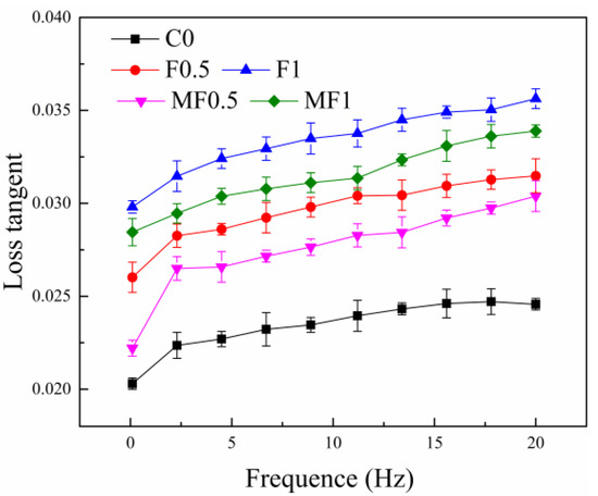 Figure 9 shows cement specimen loss tangents at 0.1–20 Hz. The loss tangent increased for all specimens as the frequency increased. Loss tangents were higher for specimens with added flax fiber as compared to C0, and increasing the fiber content resulted in a greater improvement in the loss tangent, indicating that the addition of flax fiber improved cement damping properties. F0.5 and F1 improved the loss tangent by 29.17% and 45.83%, respectively, relative to C0 at 20 Hz, and MF0.5 and MF1 improved the loss tangent by 25% and 37.5%, respectively, relative to C0 at the same frequency. The loss tangent of alkali-modified flax fiber reinforced cement pastes was lower as compared to that of raw flax fiber reinforced cement pastes. In other words, alkali treatment decreased the damping properties of flax fiber in the cement composites.