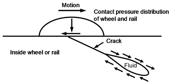 - Bogdanski, S.; Lewicki, P. 3D model of liquid entrapment mechanism for rolling contact fatigue cracks in rails. Wear 2008, 265, 1356–1362. [Google Scholar] [CrossRef]