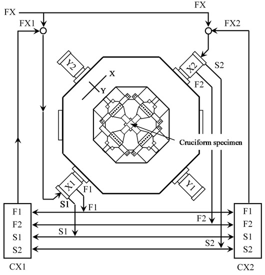 Schematic of the in-plane biaxial testing machine and the system controlling the load signals for the actuators.
