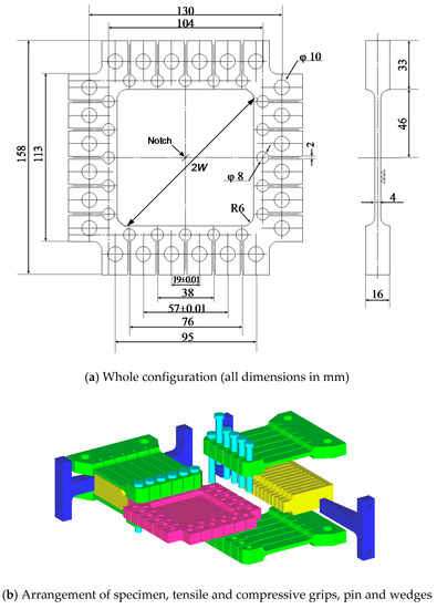 Cruciform specimens (Figure 3) having the 45° starter notch with a half-length of 2 mm, made by spark erosion, were used in the experiments [15]. Each specimen had a uniformly stressed square working section (72 × 72 mm, 4 mm in thickness) to observe crack growth behaviors. The tensile and compressive loads were applied, respectively, through pins and at the specimen edge; the backlash was removed via wedge tightening. The starter notch was pre-cracked by using an equibiaxial mode I loading with a zero stress ratio. The load was reduced during pre-cracking in 10% steps until an FCG rate of less than 10−9 m/cycle was reached. This was to reduce the residual plastic zone size to less than that produced during the first cycle of the test.