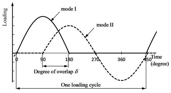 Loading cycle applied under the condition of ΔKII/ΔKI = 1.5 and δ = 90°.