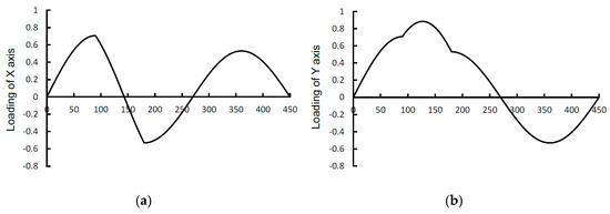 Sequential loading cycle of the (a) x and (b) y axes under the condition of ΔKII/ΔKI = 1.5 and δ = 90°; the vertical axis represents the relative values of the loads of x- and y-axes.