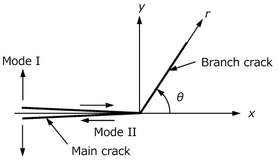 A polar coordinate system having the origin coinciding with the crack tip was introduced, as shown in Figure 6 together with a schematic representation of the main coplanar crack plane and its angle (θ) with the branch crack plane, when branching occurs.