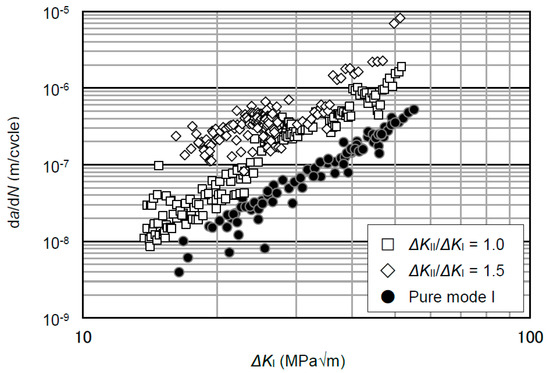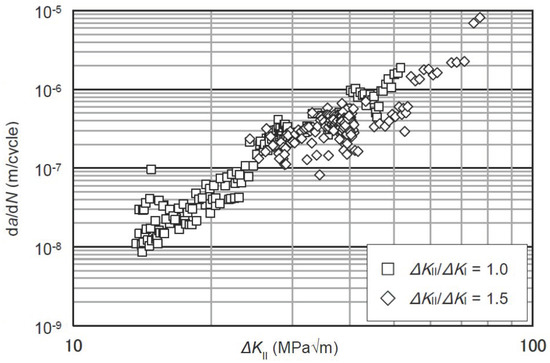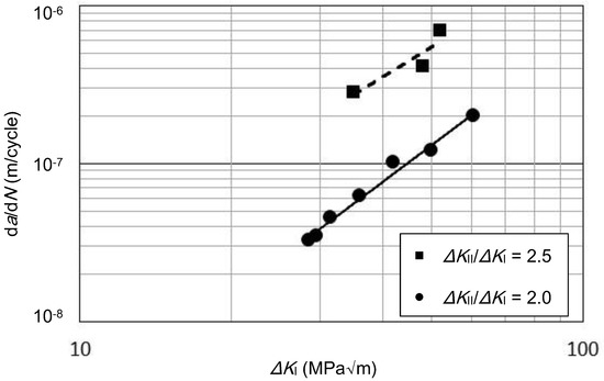 The branch crack growth rates could not be represented by a single line, as shown in Figure 11. All the cruciform specimens were tested under biaxial loading conditions and, in these cases, the non-singular stress called the T-stress acted at the crack tips. If the crack angle is not 45°, as in the branch crack case, the T-stress affects the plasticity near the crack tip and the plastic zone size increases with the shear part of the loading. Because a larger plastic zone yields higher growth rates [19], a separation of the data for ΔKII/ΔKI = 2.5 and ΔKII/ΔKI = 2.0 was observed, i.e., when the rate of shear loading was higher, the growth rates became higher.