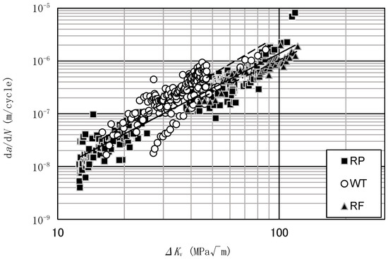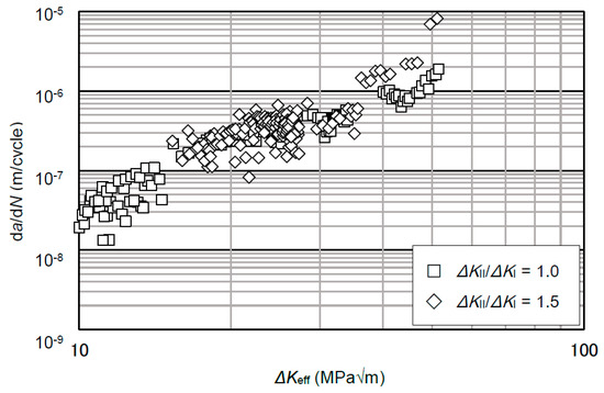 Then, since the crack growth law can be described uniquely even under different loads and stress ratios by effective SIFs, the growth rates were plotted against ΔKIeff (Figure 9). The crack growth rate data can be summarized by the equation