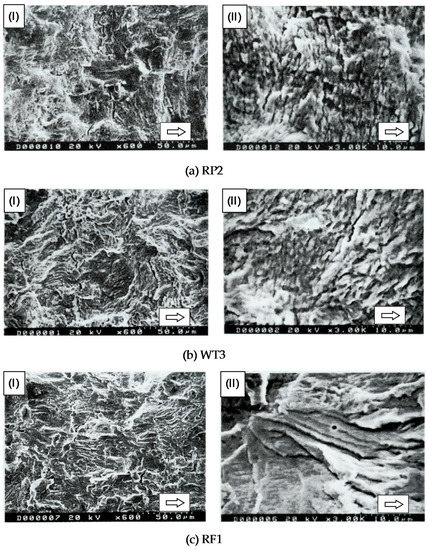 To understand the fracture mechanism, scanning electric microscope (SEM) observations were performed. Figure 12 shows the fracture surfaces near the crack tip region and along the crack flank resulting from RP2, WT3, and RF1. Heavily deformed ridges and valleys were rubbed out in the sliding direction and also several oxidized wear particles were found on the surface. No striation pattern was observed near the crack tip region in case of WT3 and RF1, but RP2 exhibited obscure striations that seemed to be scattered. Hence, the fractographic observation permitted the determination of the crack growth caused by non-proportional mixed mode I/II loading, which was clearly distinguishable from that generated by pure mode I loading.