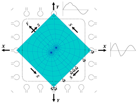 Finite element mesh and boundary conditions for the cruciform specimen under mixed mode I/II loading.