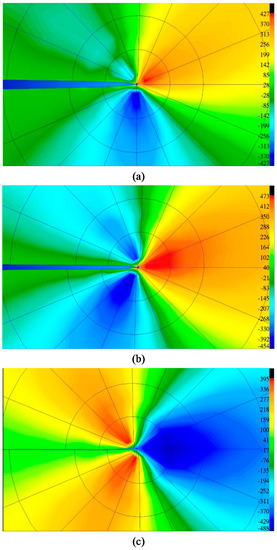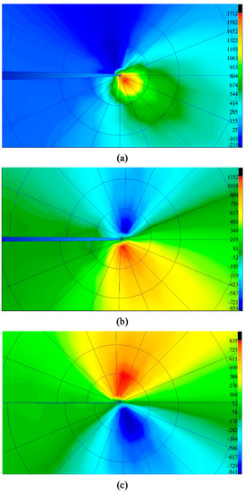 Tangential stress distribution near the crack tip for ARP2 (ΔKII/ΔKI = 1.5, δ = 120°) at the (a) 90° (maximum KI), (b) 150° (maximum KII), and (c) 330° (minimum KII); contour levels in MPa and the deformation magnification is 5×.