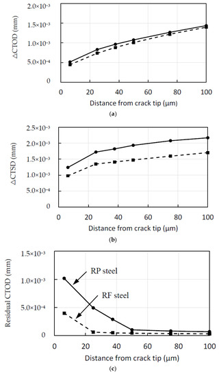 ΔCTOD and ΔCTSD were obtained for both RP and RF via FEA since they can influence the crack growth rate. In fact, a vector crack tip displacement (CTD) criterion has been proposed by Li [24] to correlate mixed mode FCG rates. This criterion was based on the concept that the vector CTD range (ΔCTD) is the driving force for FCG. Here, the vector ΔCTD corresponded to the vector summation of ΔCTOD and ΔCTSD. The FEA results indicated that ΔCTOD and ΔCTSD of RF were smaller than those of RP, probably because the former was a high-strength steel (Table 2); besides, RF exhibited much smaller residual CTOD and its opening distance under no loading compared to RP. Since there were irregularities on the crack faces, there is a possibility that the mode II loading might have been attenuated, especially in RF. This implies that the crack growth rate in RF was lower than that in RP, explaining the experimental results.