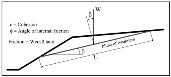 The internal stability of a soil slope can be determined by four basic factors, including the slope angle in degrees (β), soil weight in N (W), cohesion in N/m2 (c), and internal friction angle in phi (ϕ) as per Figure 4. The cohesion is a measure of the forces that cement particles of soil, and the internal friction angle is a measure of the shear strength of soils due to friction. The force causing failure, the resisting strength, and the factor of safety are also dependent upon the length of the plane of weakness in m (L) as follows [34]: