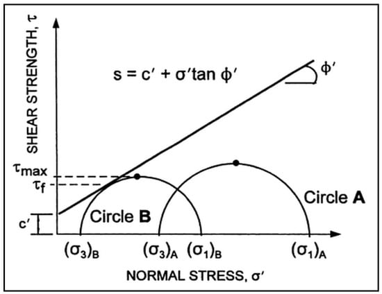 According to the Mohr–Coulomb failure criteria theory, a material fails because of a combination of normal stress and shear stress. The combination of stresses creates a more critical limiting state than would exist if the principal stresses were acting individually. This concept is illustrated by the Mohr–Coulomb failure envelope in Figure 5 [34]. Circle A is indicative of a safe stress state since it is plotted below the failure line. Conversely, a critical stress combination is evident for Circle B, which is tangential to the failure envelope.