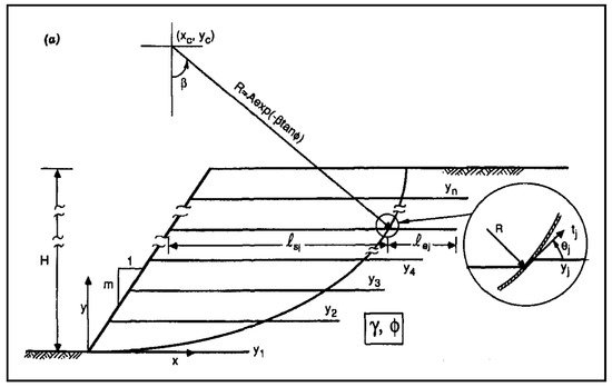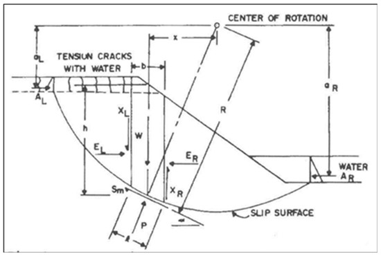 To define the limit-equilibrium conditions, Bishop investigated the use of the slip circle in the stability analysis of slopes as per Figure 6 [37]. The circular failure analysis is performed on a cross-section by dividing it into vertical slices, resolving forces on each slice to calculate the factor of safety, and summing all slice results over the entire slope to obtain an overall factor of safety. It is typically used for a quick analysis of a simple slope composed of unconsolidated materials. The following equation is used to calculate the factor of safety (FS):