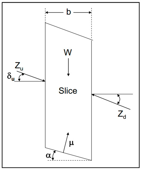 Spencer developed another method of analysis for embankment stability by assuming parallel interslice forces as per Figure 7 [38]. It can be used for both circular and non-circular failure surfaces in simple structures and can verify a Bishop analysis. Also, whereas the Bishop method only satisfies the vertical force and moment equilibrium, the Spencer limit-equilibrium technique balances the horizontal force, vertical force, and moment equilibrium. An iterative trial and error procedure is repeated in which values for the factor of safety and side force inclination are assumed until all conditions of force and moment equilibrium are satisfied for each slice. The following equations are used to calculate the uphill and downhill interslice forces as well as the net system moment: