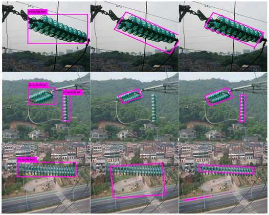 Experimental results in aerial images with insulator one fault. In each row, the first column to the third column depicts the performance of the proposed method, method [20], and method [11], respectively.