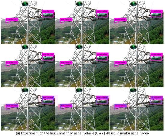 Experiments on two UAV-based insulator aerial videos. In (a,b), the performances of the proposed method in consecutive 9 frames are shown in order from left to right and top to bottom.